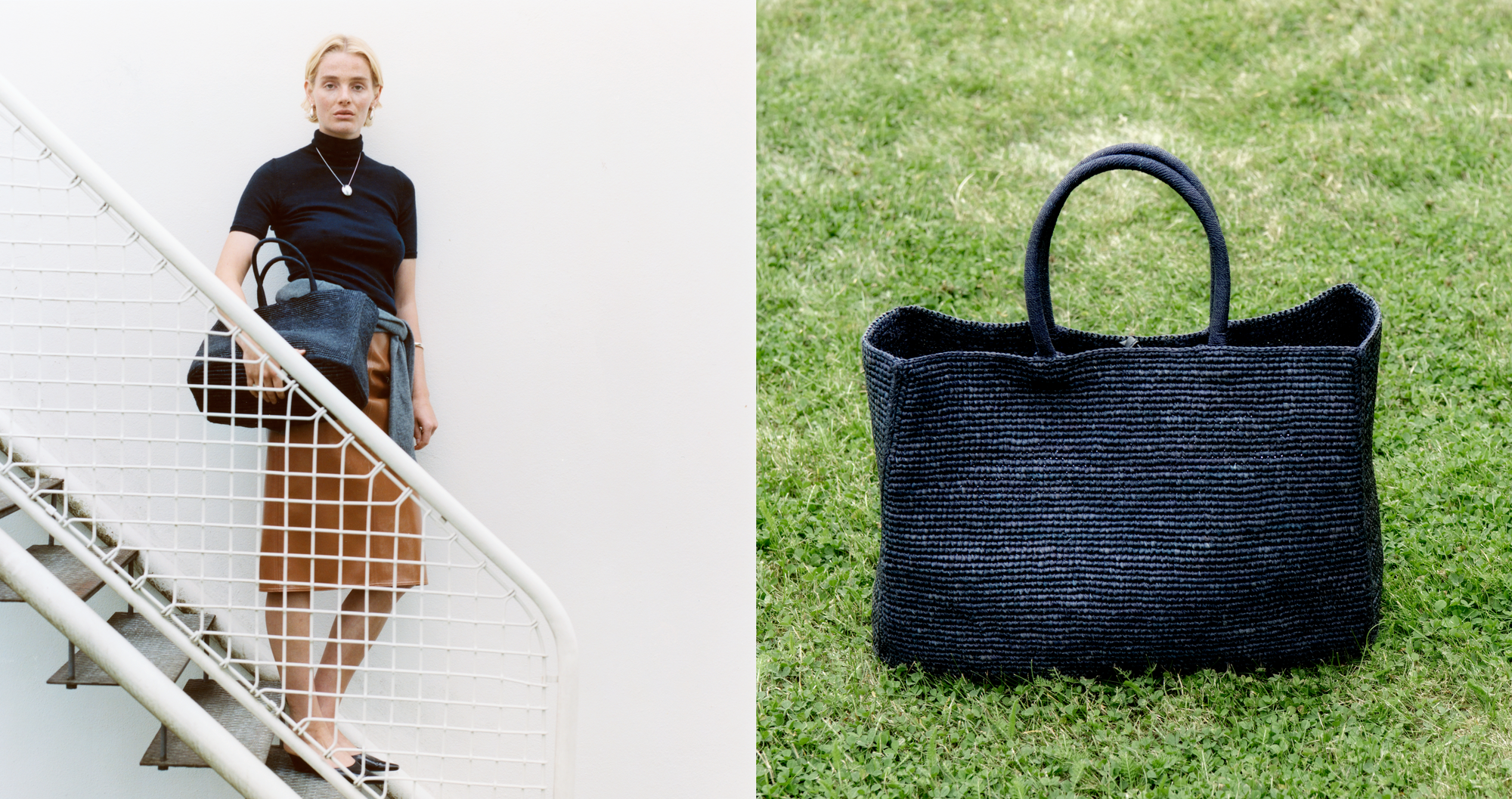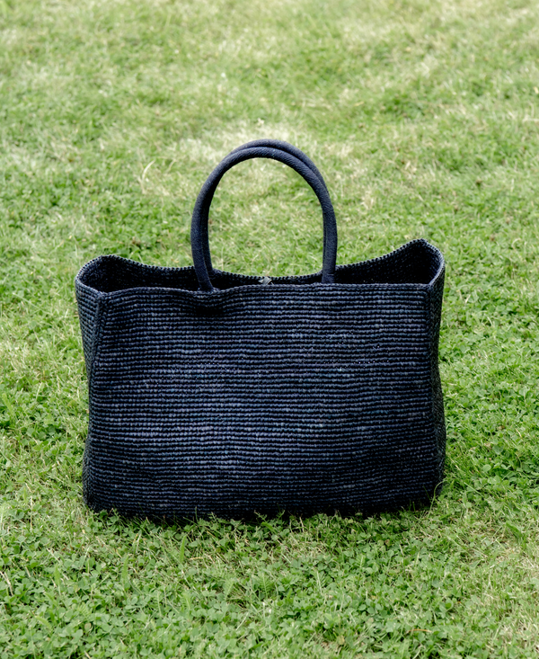 Where traditional craftsmanship meets a modern silhouette.Handwoven raffia from Madagascar.