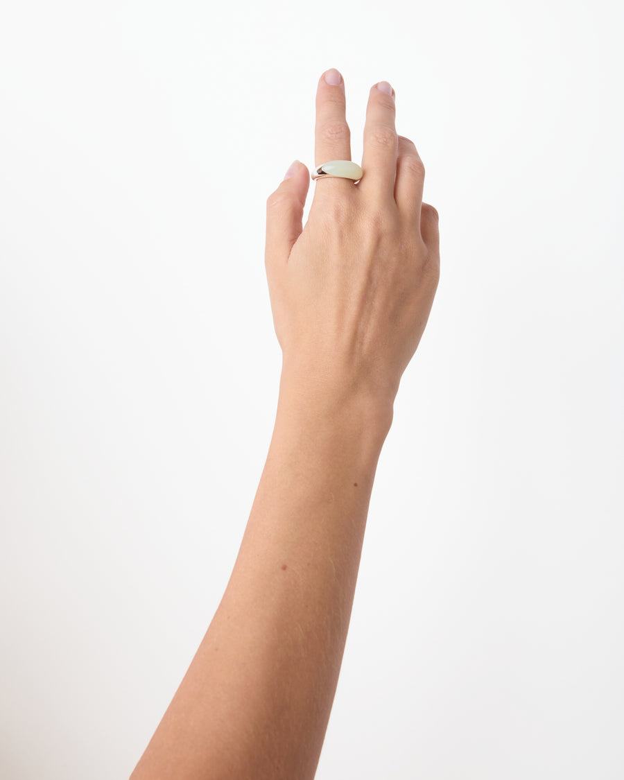 Minimal in form yet full of presence, the Beatrice Ring is designed for stacking, layering, and personal expression. A smooth, curved green serpentine gemstone is set into a polished silver or gold band, creating a harmonious interplay between organic form and clean lines.